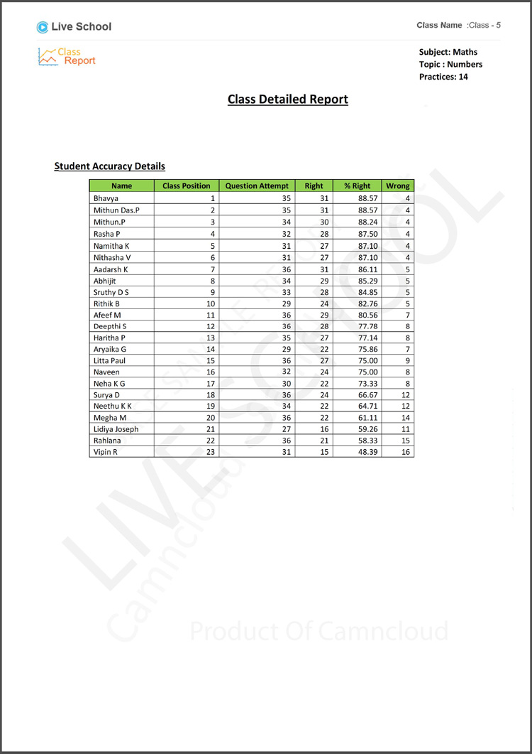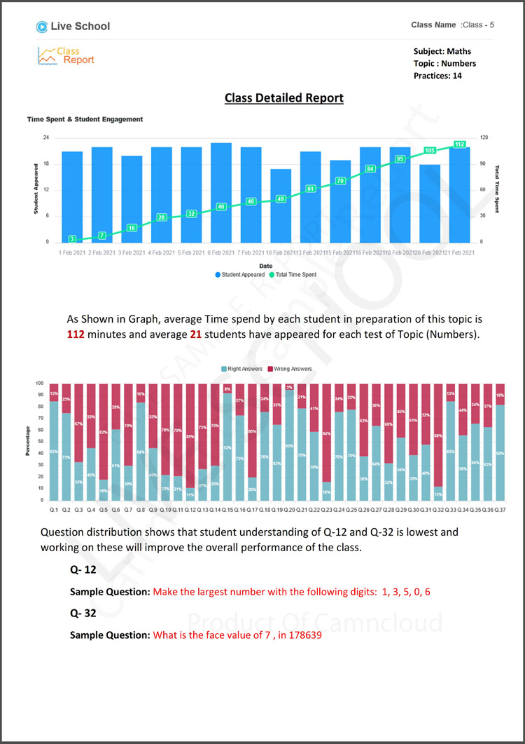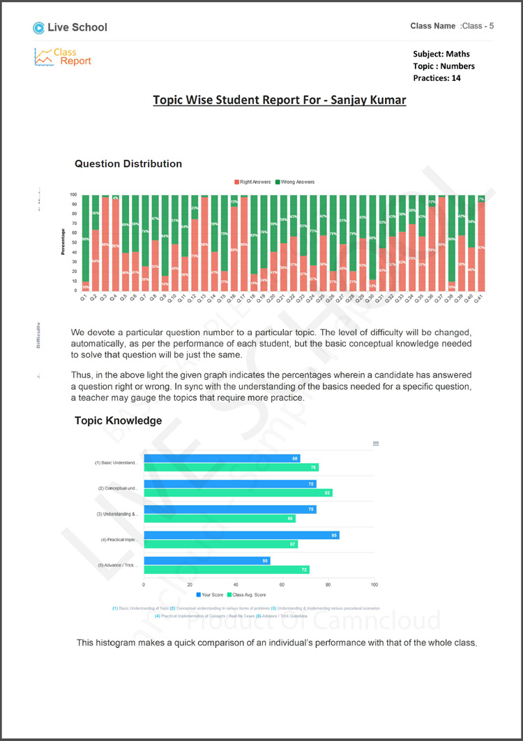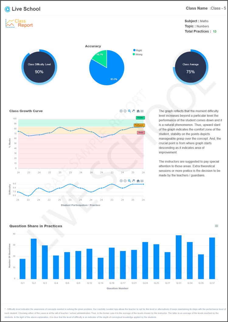 Live school provides detailed analytics of the student performance identifying the areas of improvement and the type of questions that, if addressed, will improve performance.
